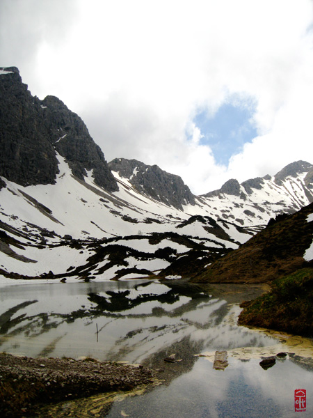 What a wonderful moment! The pollen look like doing an art on the water surface and telling spring stories to the calm, steady, rocky mountain.