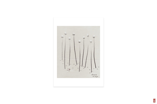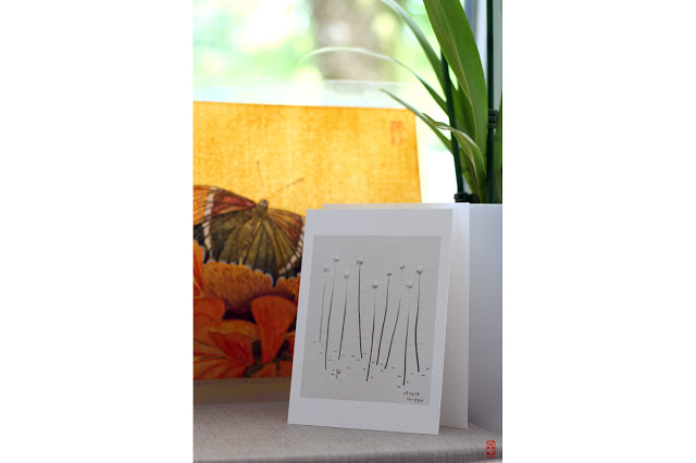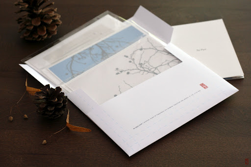 Each single sheet card is 10,5 x 14,5 / 14,5 x 10,5 cm printed on 300g paper which is usually for water color painting. It contains also a transparent cover and an envelope.
