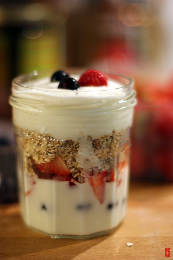 In one jar … 150g plain yoghurt, 3 or 4 spoons of cereal, 7-8 blueberries and 5 strawberries in small pieces. That’s all! If someone likes to have it sweeter, maple syrup can be dropped one or two drops on it. This one goes to my husband for tomorrow. ๐