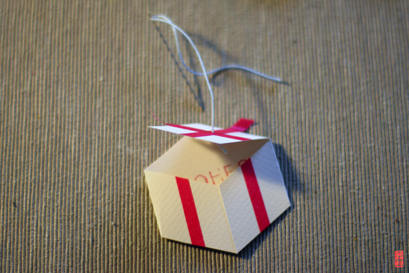 But before you stick the stripes, don’t forget to thread any yarn to hang on the present. 😉