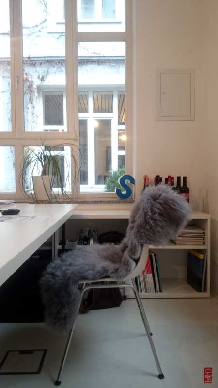 Im Büro hat jeder dieses kuscheliges Fell auf seinem Stuhl gekriegt, Schwarz, Weiß und Grau. Winter ist es.