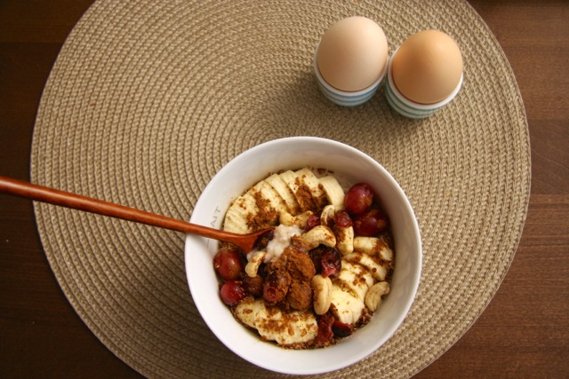 Zur Zeit mag ich gerne Porridge zum Frühstück oder zwischendurch essen, mit viel Obst, Nüße und Zimt drauf. Am Samstag zum Frühstück nahm ich mir extra gekochte Eier, denn danach gehe ich zum Taekwondo Training.